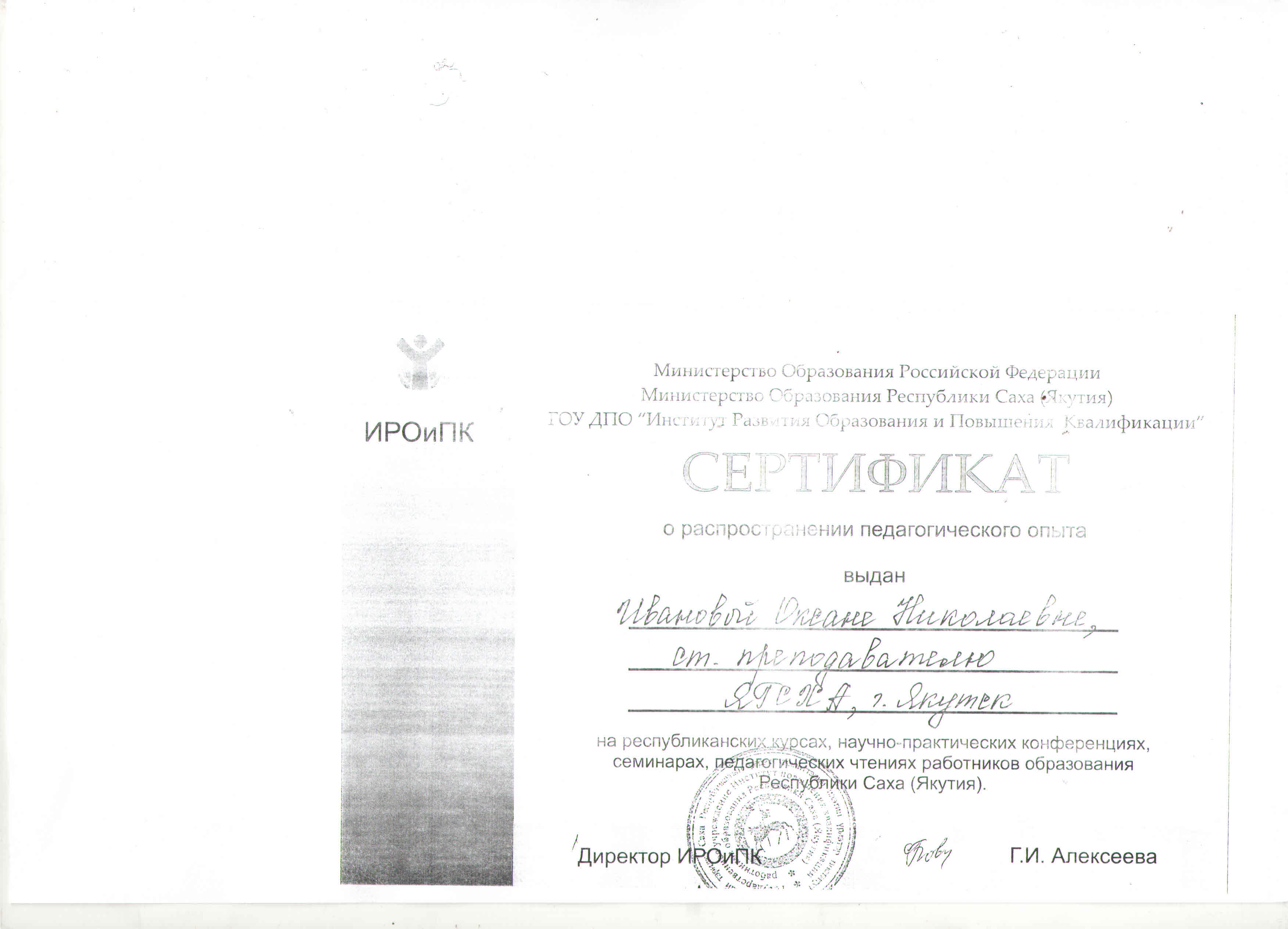 5) Сертификат о распространении педагогического опыта