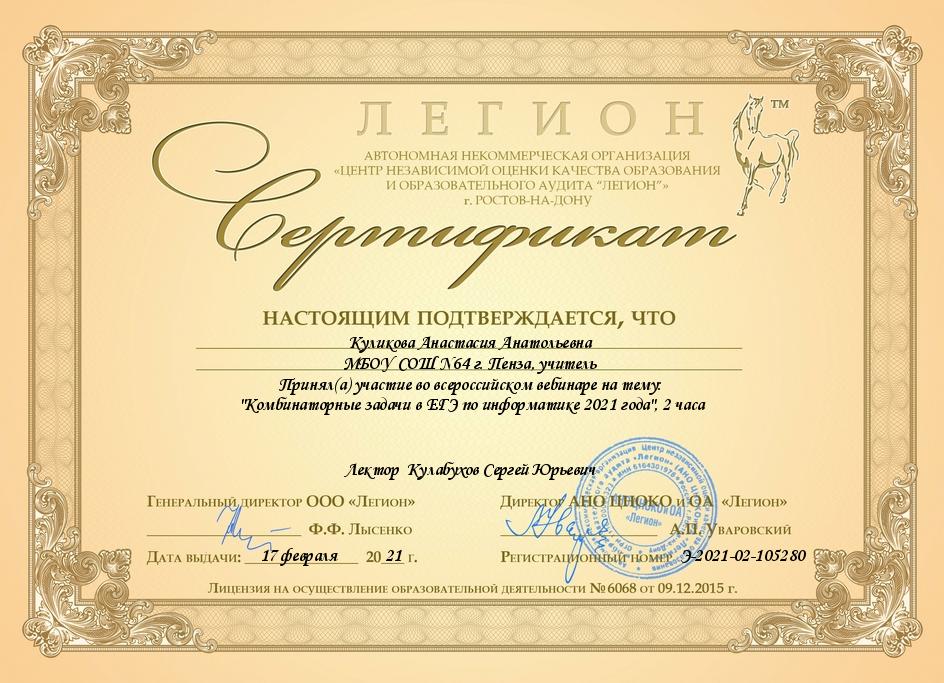 Участие в вебинаре "Комбинаторные задачи в ЕГЭ по информатике 2021 года"