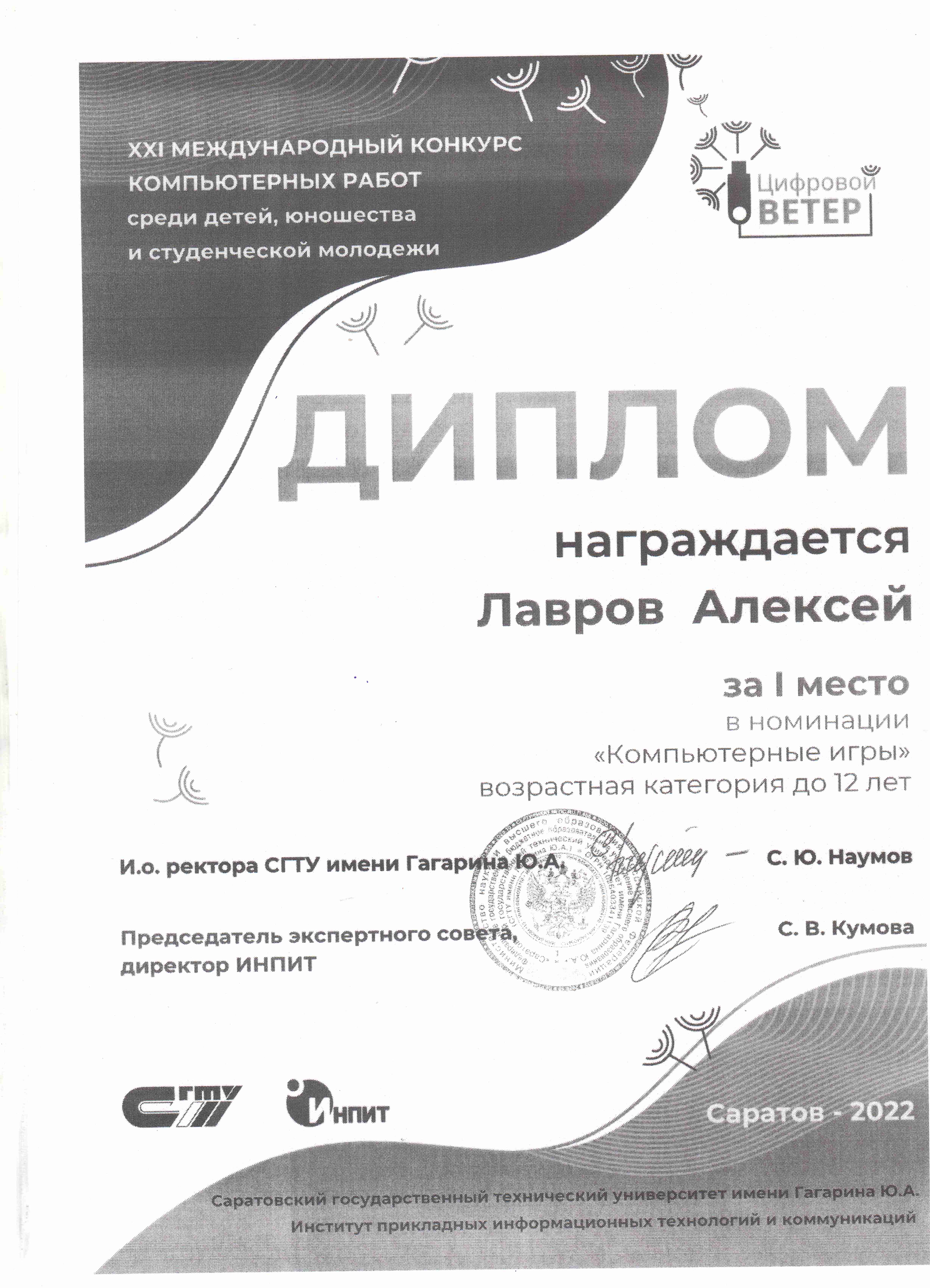 I место XXI международный конкурс компьютерных работ "Цифровой ветер" 2022