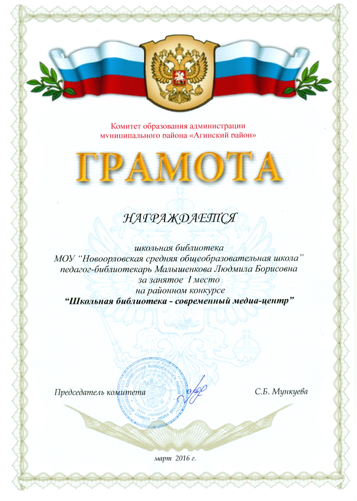 Победитель районного конкурса "Школьная библиотека - современный медиацентр" -2016г