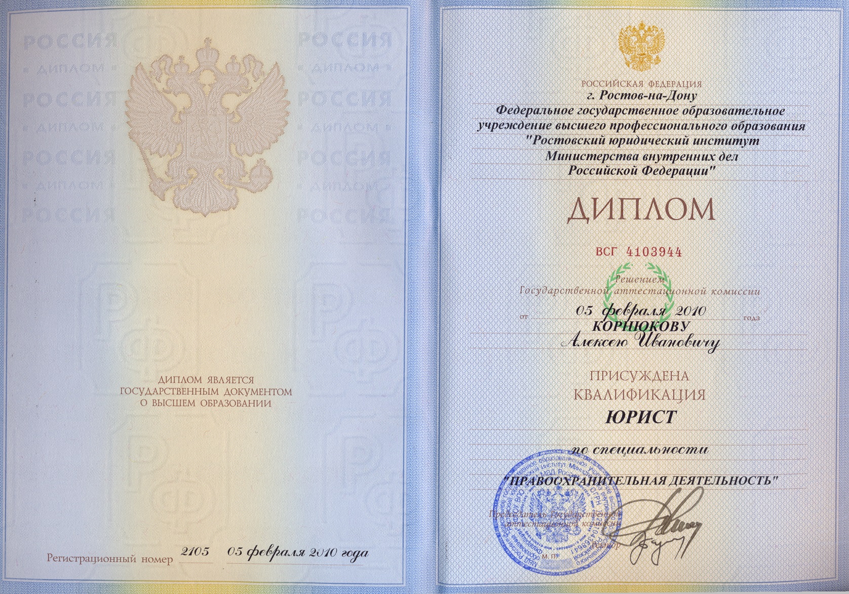 Диплом о присуждении квалификации "Юрист" по специальности "Правоохранительная деятельность" (II ВЫСШЕЕ ОБРАЗОВАНИЕ)