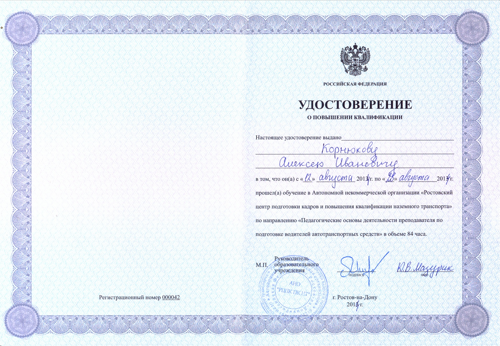 Удостоверение о повышении квалификации по направлению "Педагогические основы деятельности преподавателя по подготовке водителей ..."