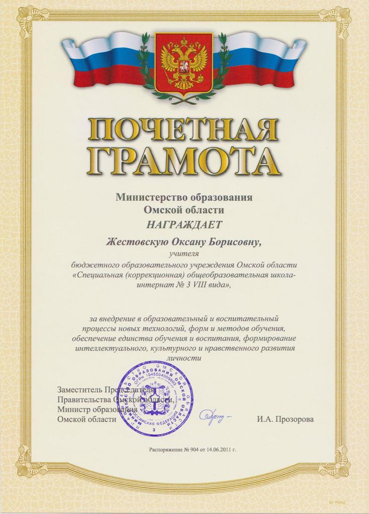 Почётная грамота Министерства образования Омской области
