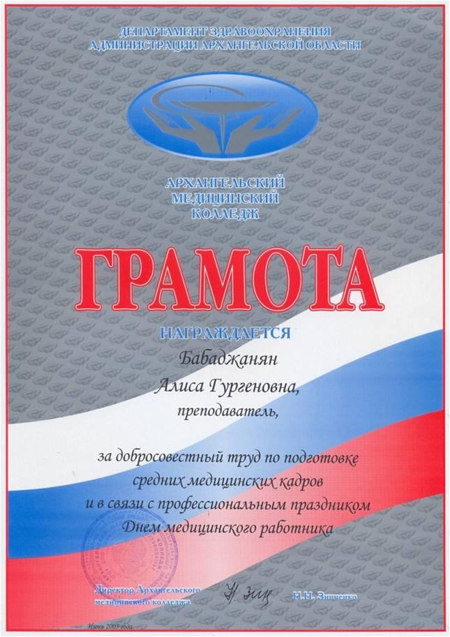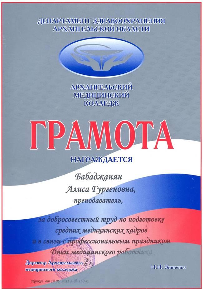 - 2011 г. грамота ГАОУ СПО АО АМК За добросовестный труд и в связи с профессиональным праздником Днем мед.работника