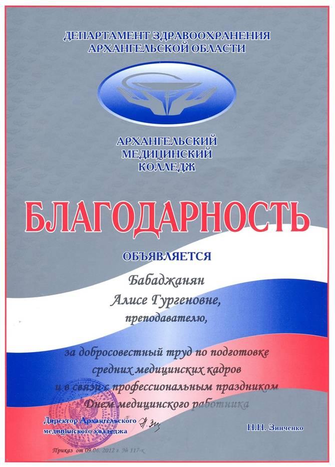 - 2012 г. благодарность ГОУ СПО АО АМК За добросовестный труд и в связи с праздником Днем мед.работника