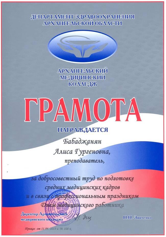 - 2013 г. грамота ГАОУ СПО АО АМК За добросовестный труд и в связи с профессиональным праздником Днем мед.работника