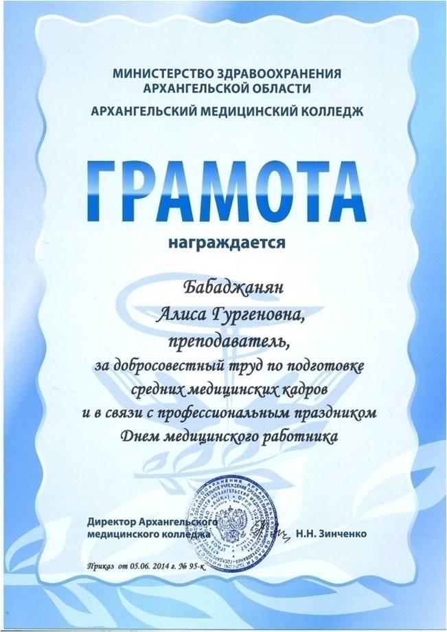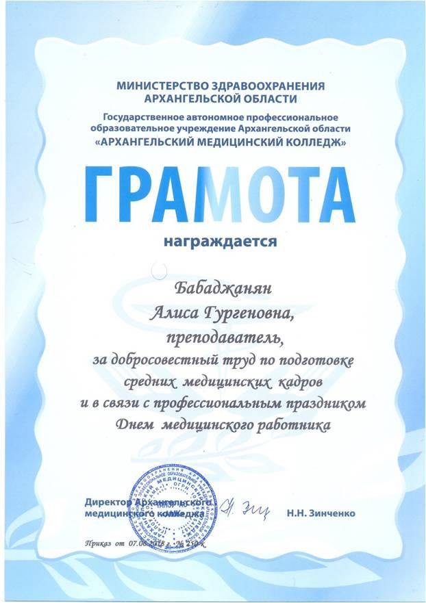 - 2014 г. грамота ГАОУ СПО АО АМК За добросовестный труд и в связи с профессиональным праздником Днем мед.работника