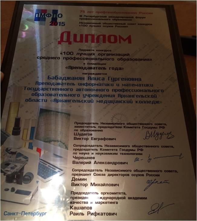 - 2015 г. диплом III Петербургский международный форум проф.образования Лауреат конкурса «100 лучших организаций среднего профессионального образования » в номинации «Преподаватель года»