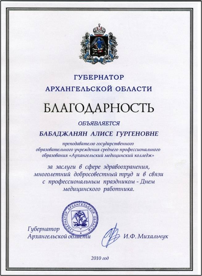 - 2010 г. благодарность Губернатора Архангельской области За заслуги в сфере ЗО, многолетний добросовестный труд и в связи с профессиональным праздником Днем мед.работника