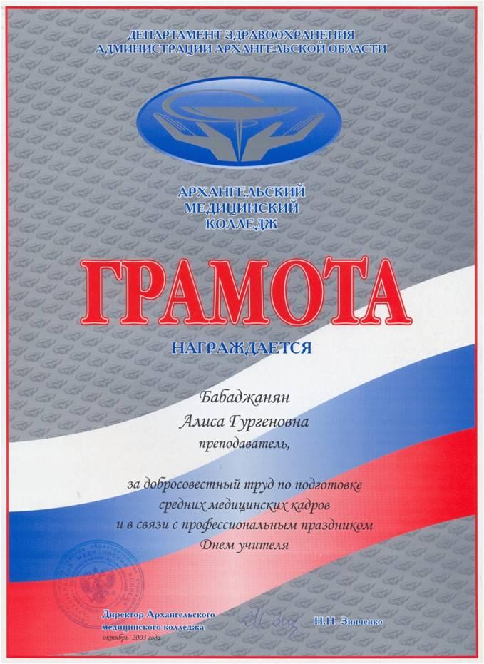 - 2003 г. грамота ГОУ СПО АОАМК За добросовестный труд и в связи с профессиональным праздником Днем учителя