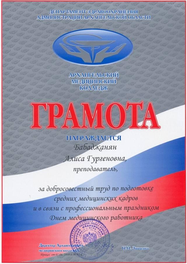 - 2008 г. грамота ГОУ СПО АМК За добросовестный труд и в связи с профессиональным праздником Днем мед.работника