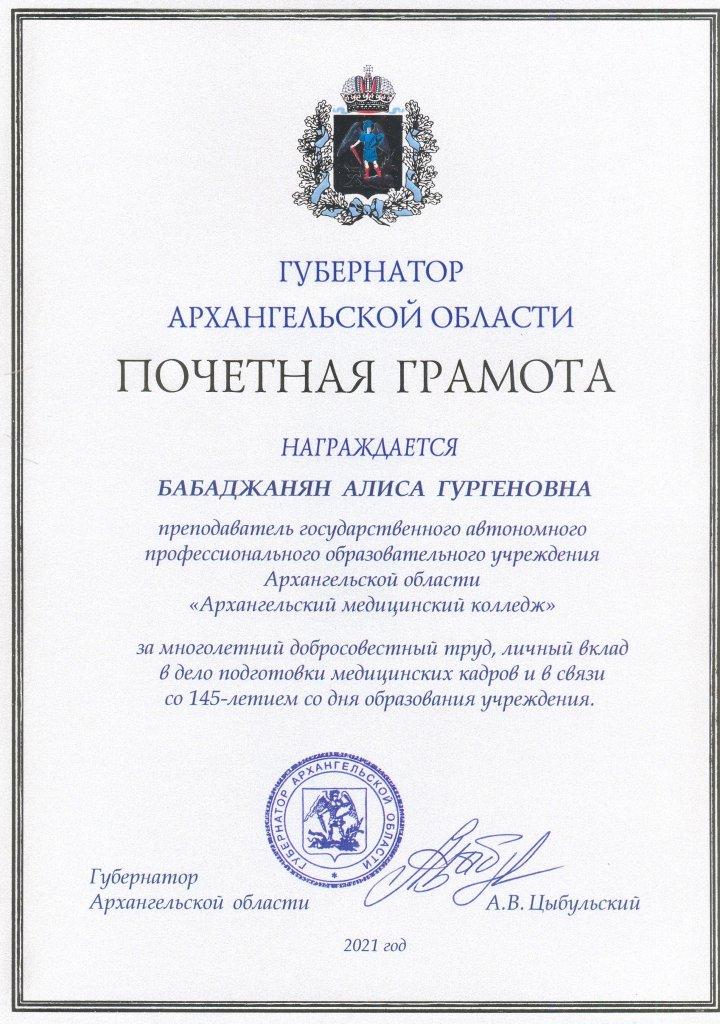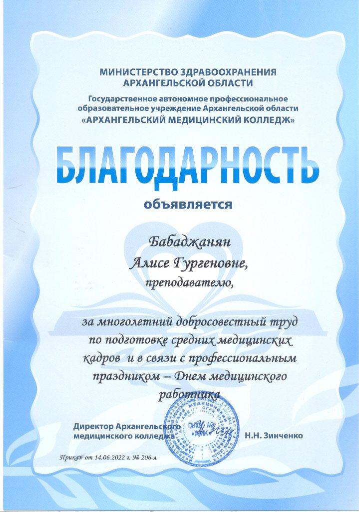 - 2022 г. Благодарность ГАПОУ АО АМК За добросовестный труд и в связи с профессиональным праздником Днем медицинского работника
