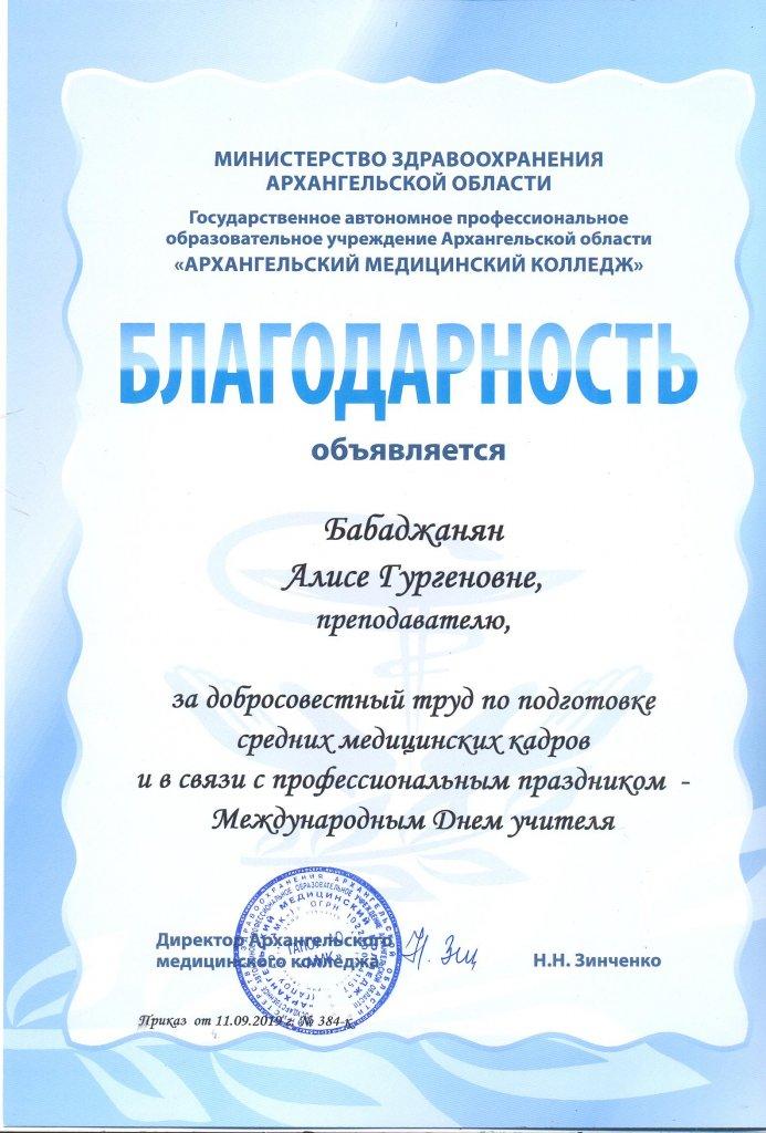 - 2019 г. благодарность ГАПОУ АО АМК За добросовестный труд и в связи с профессиональным праздником Днем учителя