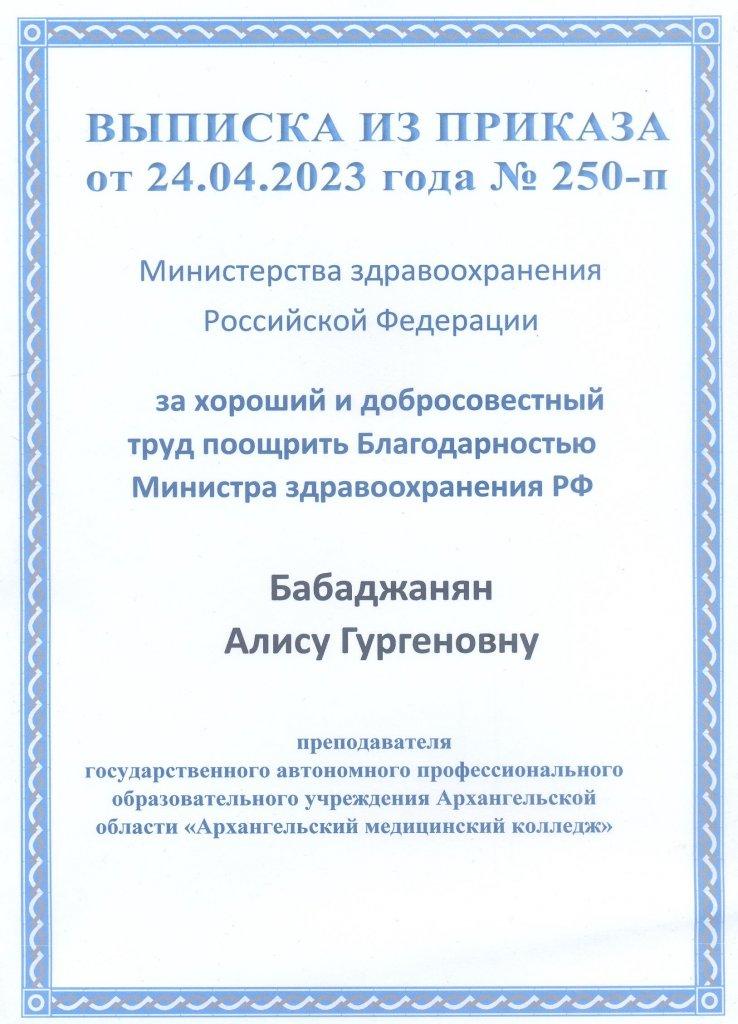 2023 г. благодарность министра здравоохранения РФ за хороший и добросовестный труд