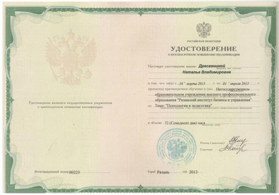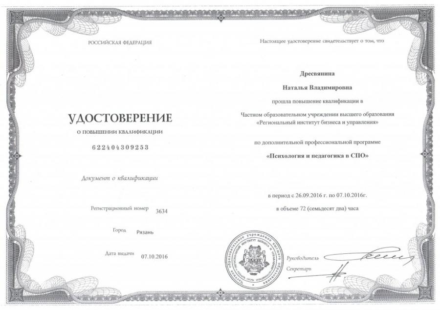 октябрь 2016 г; Частное образовательное учреждение высшего образования «Региональный институт бизнеса и управления»; «Психология и педагогика в СПО»; 72 часа