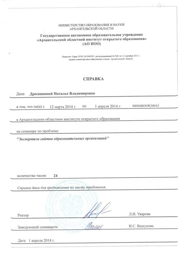 12 марта – 1 апреля 2014 г АО ИОО Архангельский областной институт открытого образования; Семинар по проблеме «Экспертиза сайтов образовательных организаций»; 24 ч