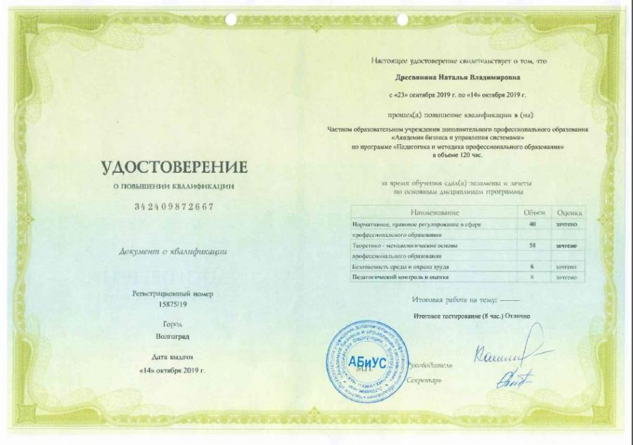 23.09. - 14.10.2019 г. ЧОУ ДПО «АБиУС» повышение квалификации по программе "Педагогика и методика профессионального образования" (120 ч.)