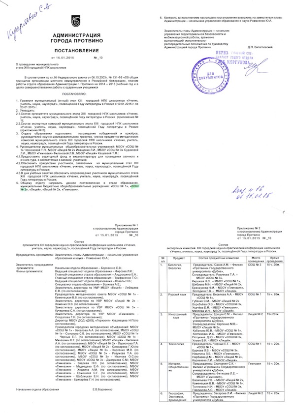 Постановление Администрации города Протвино «О проведении 14 городской научно-практической конференции школьников «Ученик, учитель, наукоград» в 2014/2015 уч.году на территории города Протвино» № 10 от 15.01.2015 Ссылка ... |