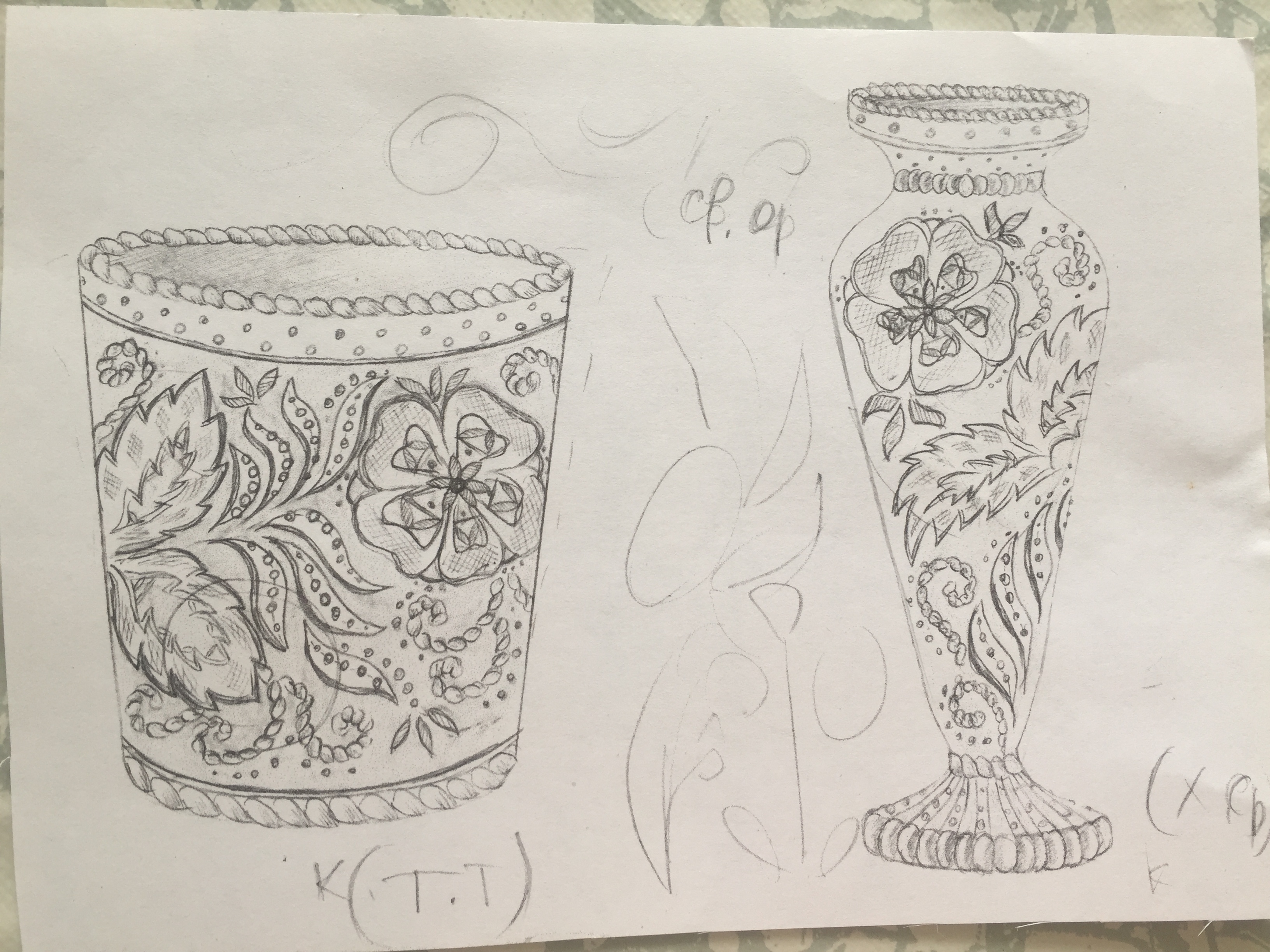 - Разработка фрагментов орнаментов предметов различными декоративными приемами с учетом особенностей специализации вида ТПИ и характерными чертами фактур и текстур материалов из которых изготовлены изображаемые предметы.