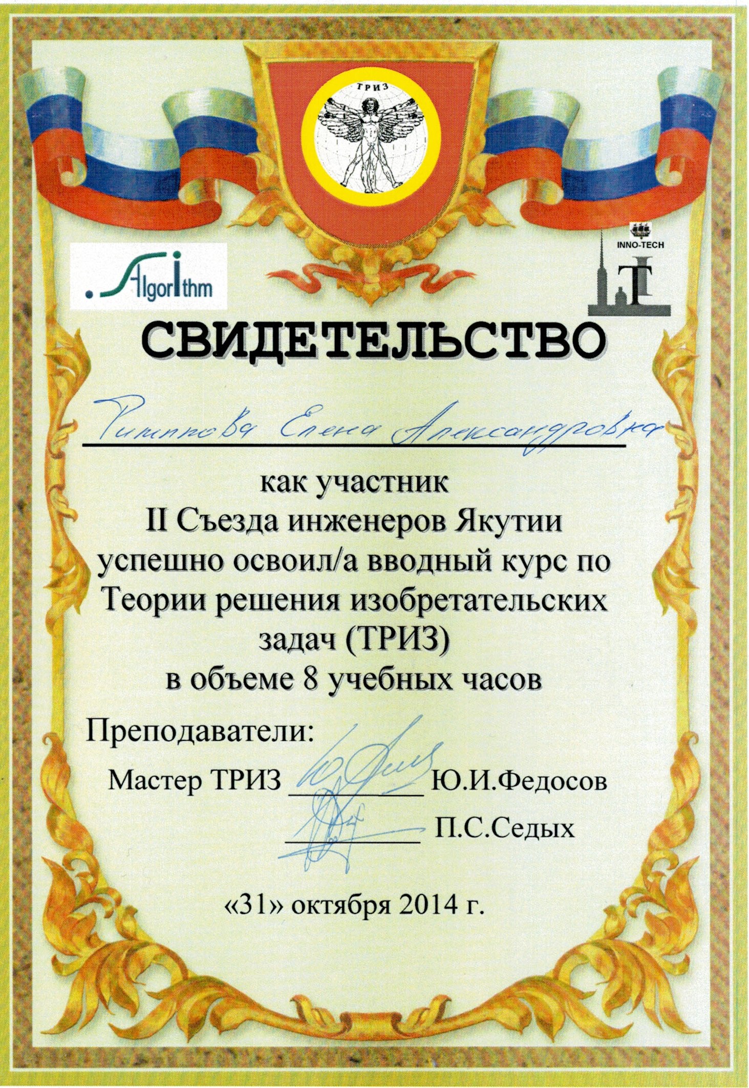 Успешно усвоила вводный курс по Теории решения исследовательских задач как участник II Съезда инженеров Якутии