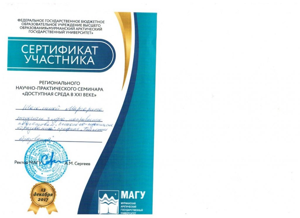 Сертификат регионального научно-практического семинара "доступная среда в XXI веке"