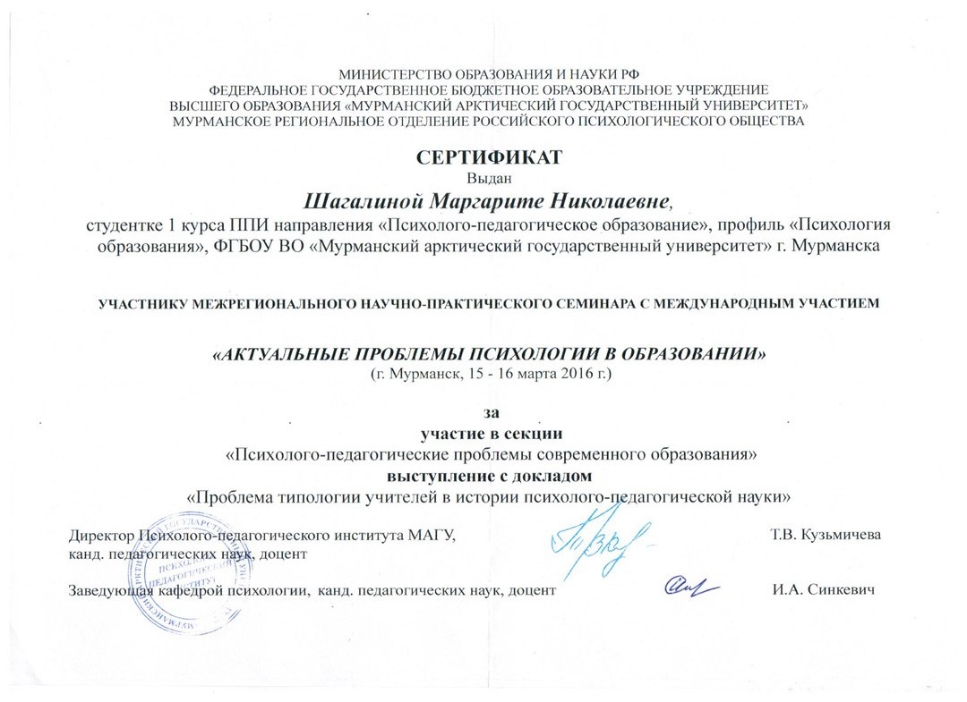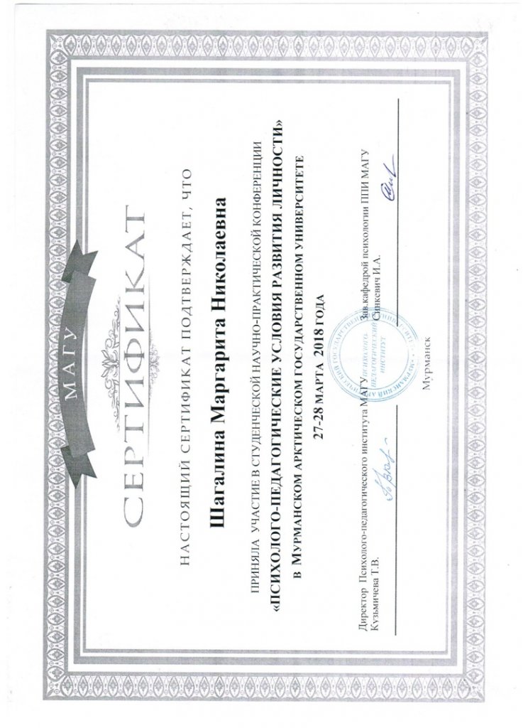 Сертификат участника межвузовской студенческой научно-практической конференции "Психолого-педагогические условия развития личности"