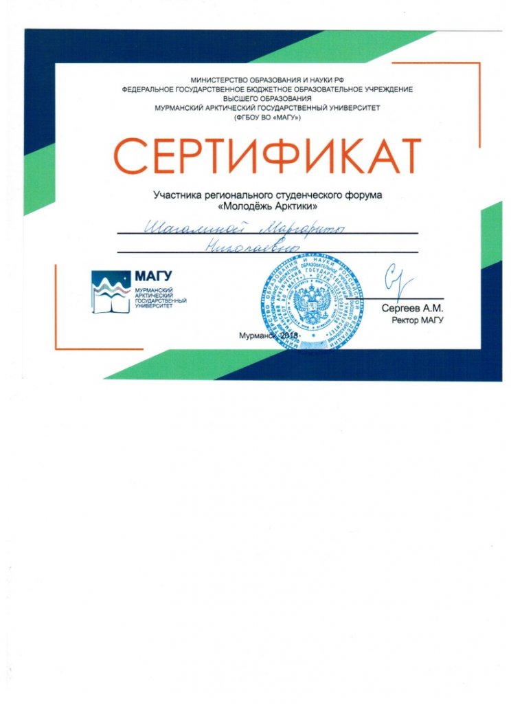 Сертификат участника регионального студенческого форума "Молодежь Арктики"
