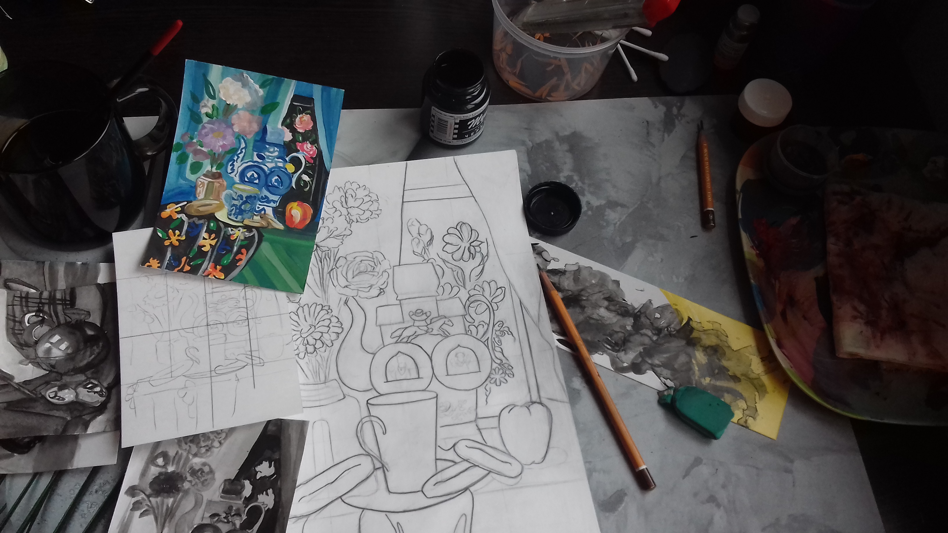 Здравствуйте! Пока продолжаем заниматься по плану Декоративной живописи. Продолжаем разработку декоративных эскизов по теме "Декоративное решение натюрморта" на основе выполненной работы н-т с гжельским квасником и букетом цветов.