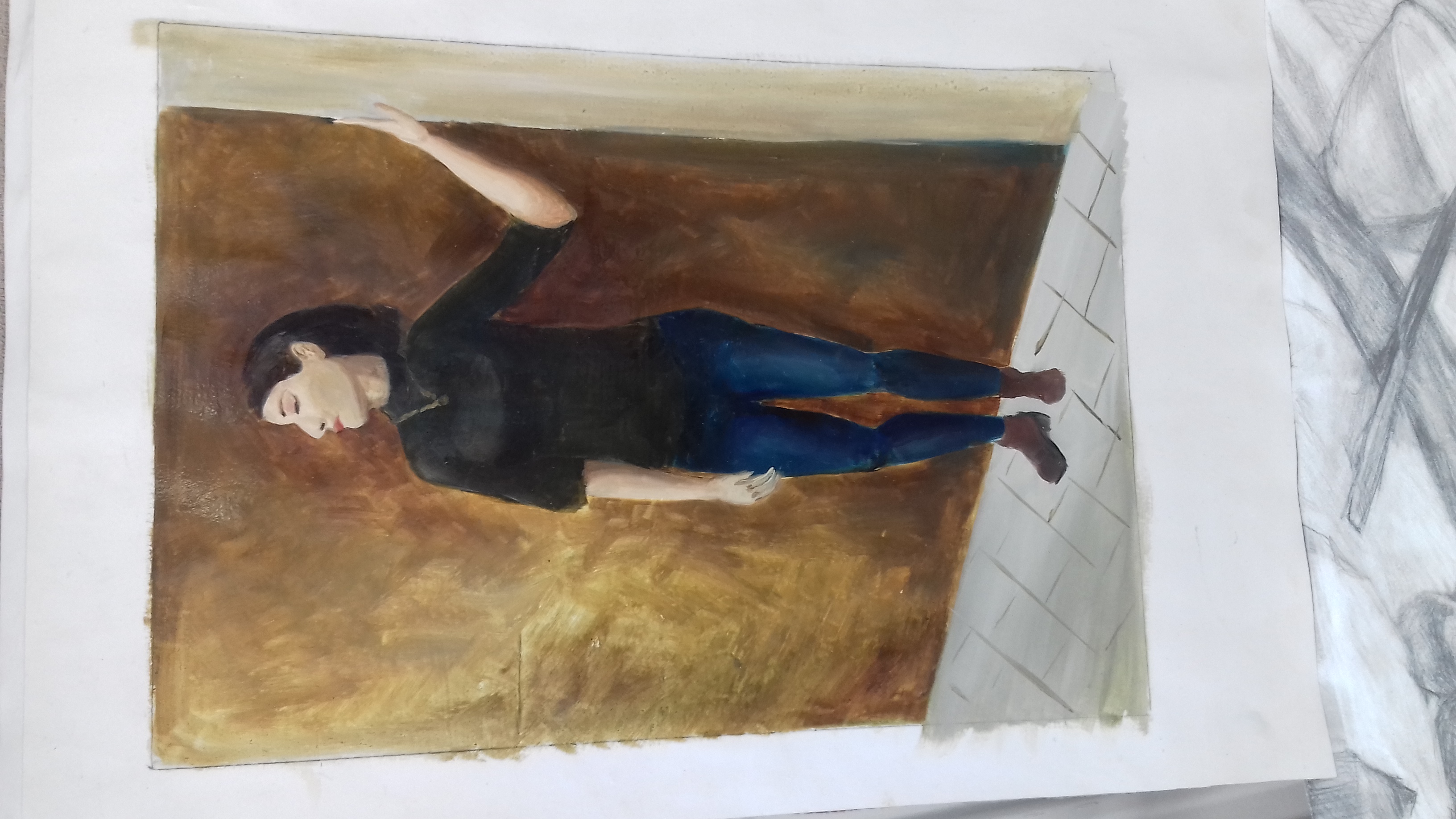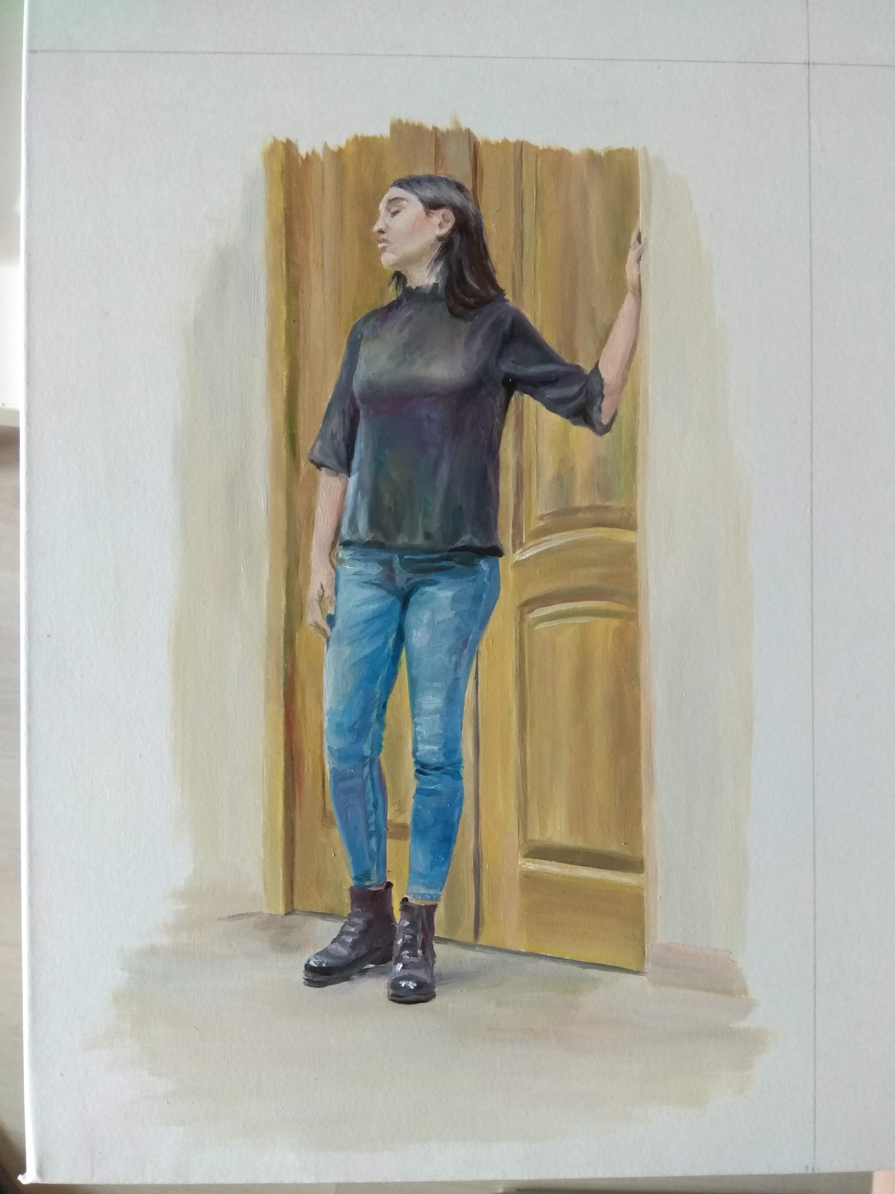 ХОД ЗАНЯТИЯ: Обсуждение этапов выполнения живописного наброска: линейного изображения; тонально-цветово исполнения моделировки формы фигуры; взаимосвязь фигуры со средой интерьера способом передачи касаний объектов с поверхностями и падающими тенями. Перенесение найденной компоновки фигуры с пропорциональными соотношениями (головы, шеи, плечевым поясом, грудной клеткой, тазо-бедренной области, ног в области коленей, развороты стоп, направления падающей тени, плоскости пола и стены, двери) в заданный формат 30Х21 см. .