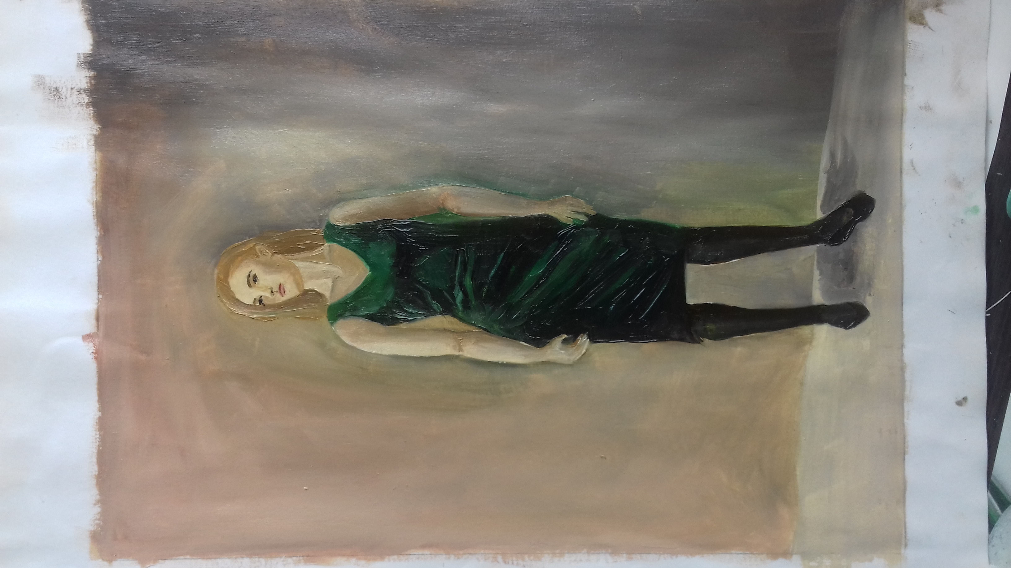 ХОД ЗАНЯТИЯ: Обсуждение этапов выполнения живописного наброска: линейного изображения; тонально-цветового исполнения, моделировки формы фигуры; взаимосвязь фигуры со средой интерьера способом передачи касаний объектов с поверхностями и падающими тенями. Перенесение найденной компоновки фигуры с пропорциональными соотношениями (головы, шеи, плечевым поясом, грудной клеткой, тазо-бедренной области, ног в области коленей, развороты стоп, направления падающей тени, плоскости пола и стены, двери) в заданный формат 30Х21 см. .
