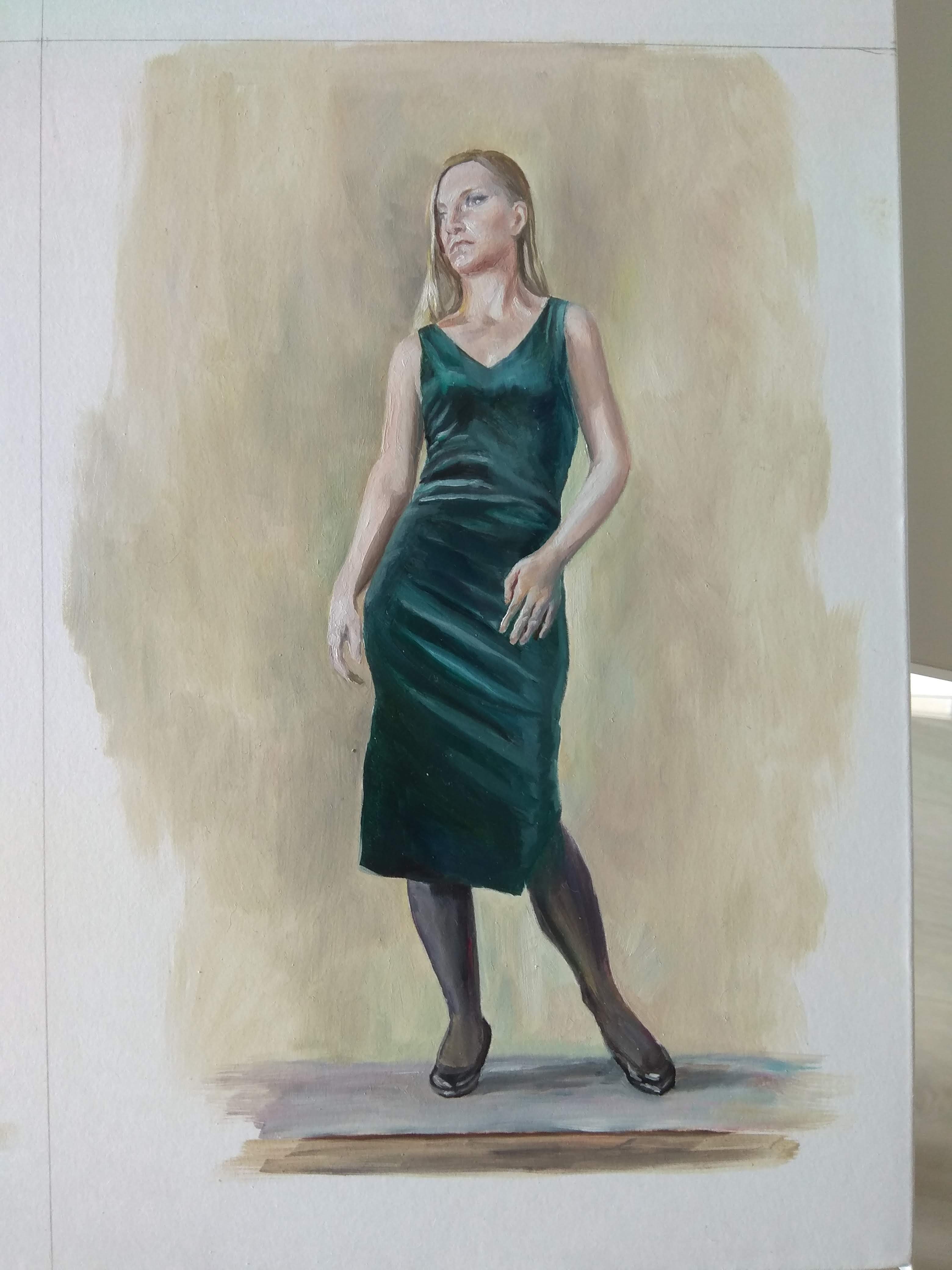 2. продолжение выполнения 3 живописной стадии в заданный формат 60Х40 см.. Моделировать форму фигуры в костюме с применением тональных и цветовых градаций, с учётом освещения, локальности цветов тона на форме модели и костюма, учитывая рефлексию, выделяя главное. Погружение в свето-воздушную среду фигуры в костюме, взаимосвязь способом "лессировки" изображения падающей тени с мягкими косниями. Контрастное моделирование теней в начале их образования. Выделение акцентами главного. Создание цветовой гармонии.