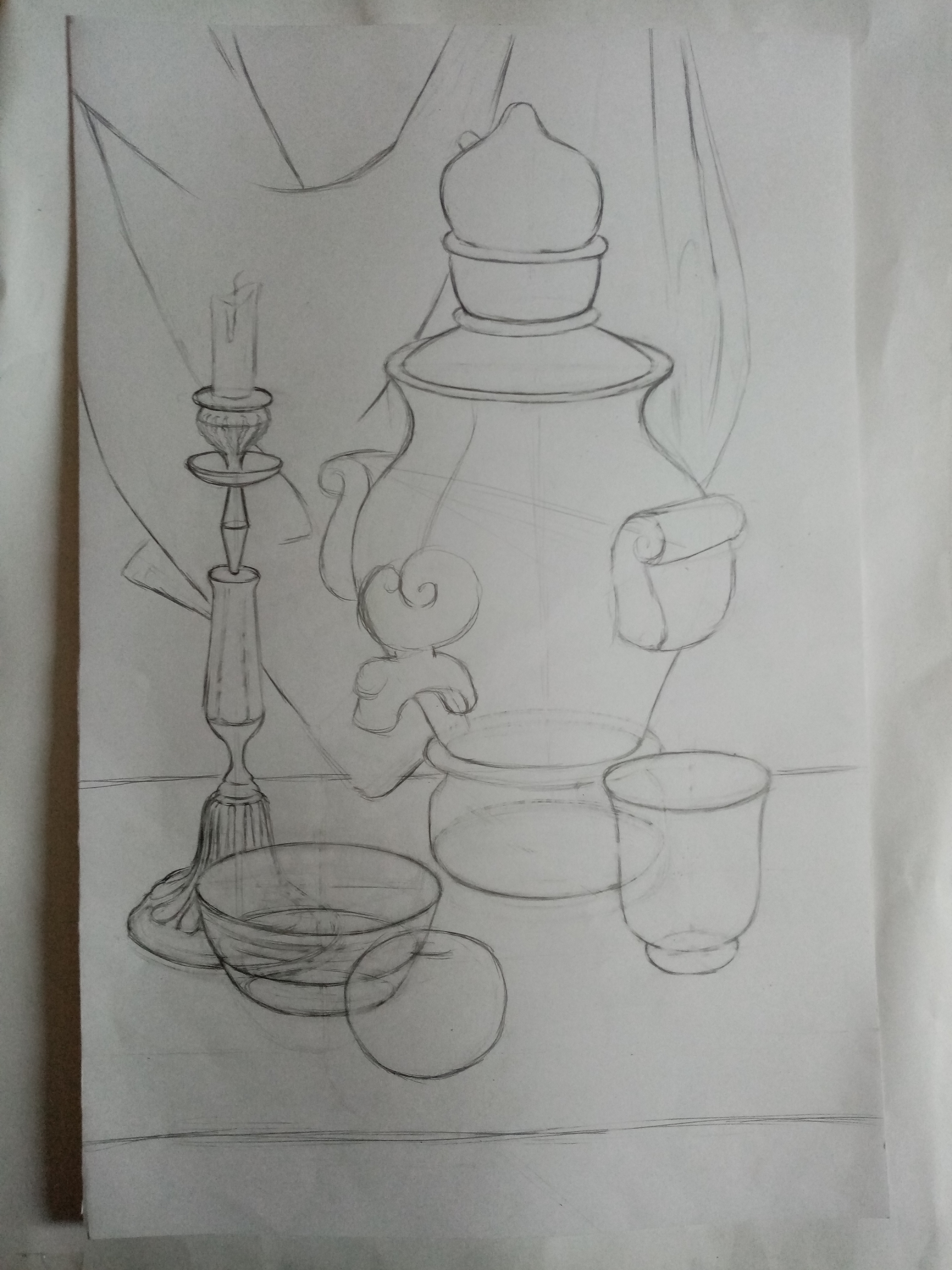 ХОД ЗАНЯТИЯ: Обсуждение выполненных эскизов (линейного, тонального, цветового). Перенесение линейным рисунком композиции натюрморта по эскизу в заданный формат 60Х40 см. Выполнение линейно-конструктивного построения с соблюдением пропорциональных соотношениями предметов. Уточнение характерных черт деталей предметов и распределение по их форме орнаментов.